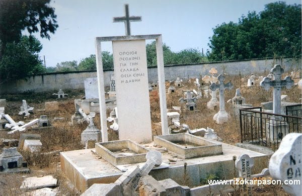 Υ/Γ. Σήμερα η τελευταία κλίνη του ήρωα, μοιραζόμενη από τον έτερο μαθητή ήρωα Κασπή, στέκει και μας περιμένει στο κατεχόμενο Ριζοκάρπασο. Με τον σταυρό στην κορφή και τη θεία δάφνη που χάρισε ο θάνατος για την Ελλάδα προσμένει τους λεύτερους λευτερωτές. Ποιος από εμάς θα αξιωθεί, υπερήφανος σημαιοφόρος κι αυτός, να υψώσει τη γαλανόλευκη ξανά και μόνιμα στο σημείο που αναπαύεται αιώνια το σώμα των ηρώων;